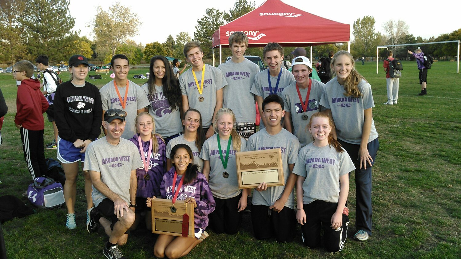 Arvada West boys and girls team, plus coaches, dispaying their Jeffco first place plaques